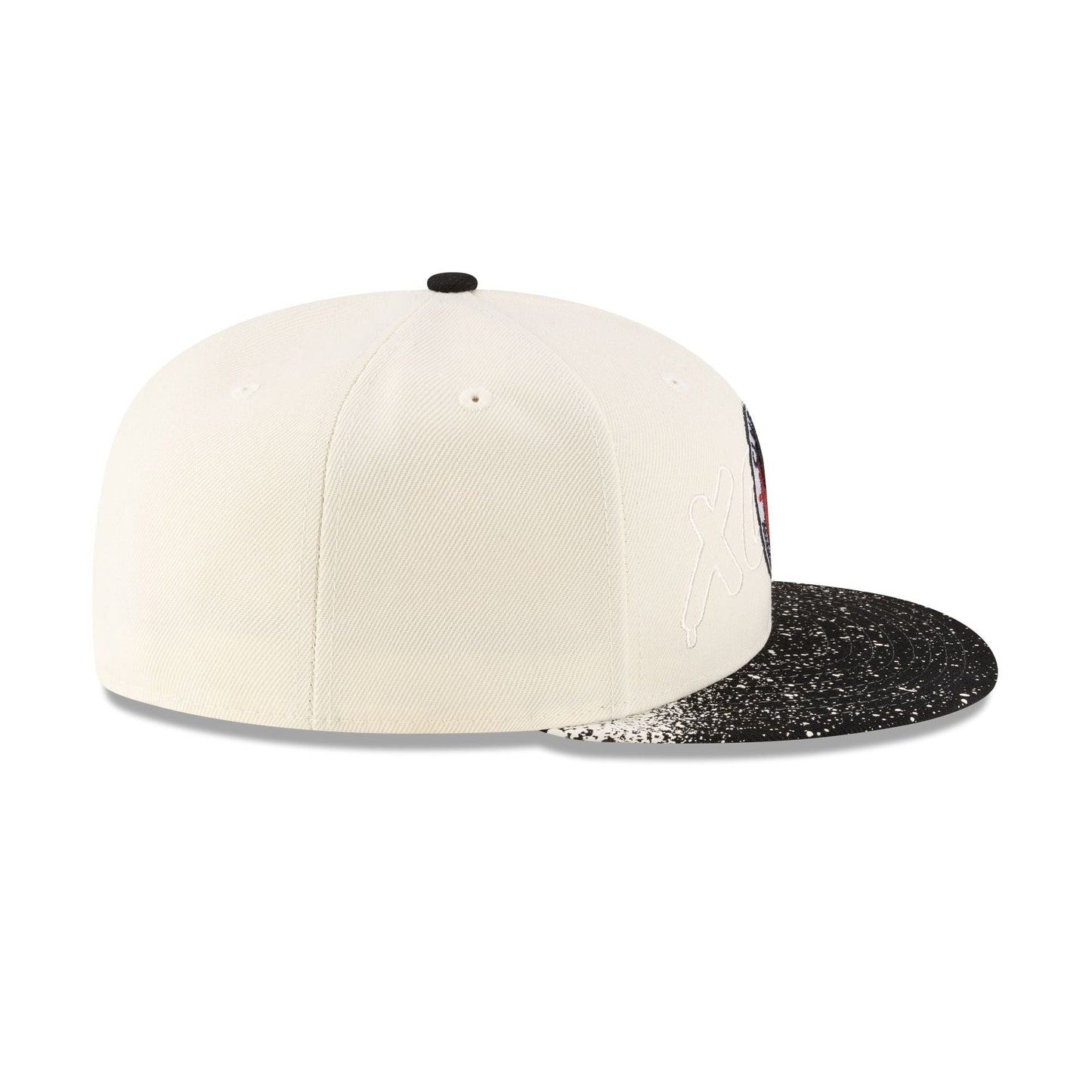 The Xolos Splattered Visor 59FIFTY Fitted Cap features an embroidered Xolos graffiti wordmark with a layered logo on top and a paint splatter detailed visor. Additional details include a team wordmark at the rear and a black undervisor.